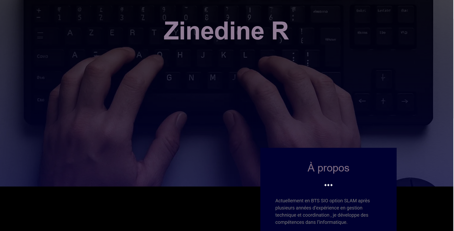 REGAIGUI Zinedine actuellement en BTS SIO option SLAM après plusieurs années d’expérience en gestion technique et coordination, je développe des compétences dans l’informatique. Motivé par le développement web et d’application.